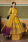 This exquisite mustard peshwas is heavily embroidered with gotta work, crystals, adda work and sequins on the bodice and on all the panels. It’s paired with a mustard sharara with heavy embellishment on the border and a mustard-purple organza dubatta that has four sided lace borders.