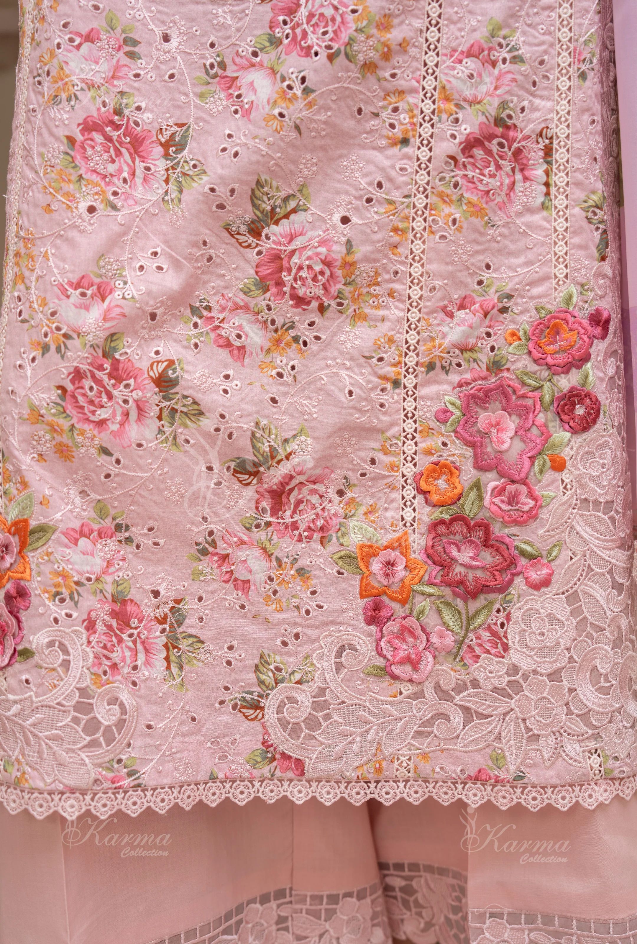 Long Printed Shirt with Chikankari and 3D Floral Neckline, Patches on Border