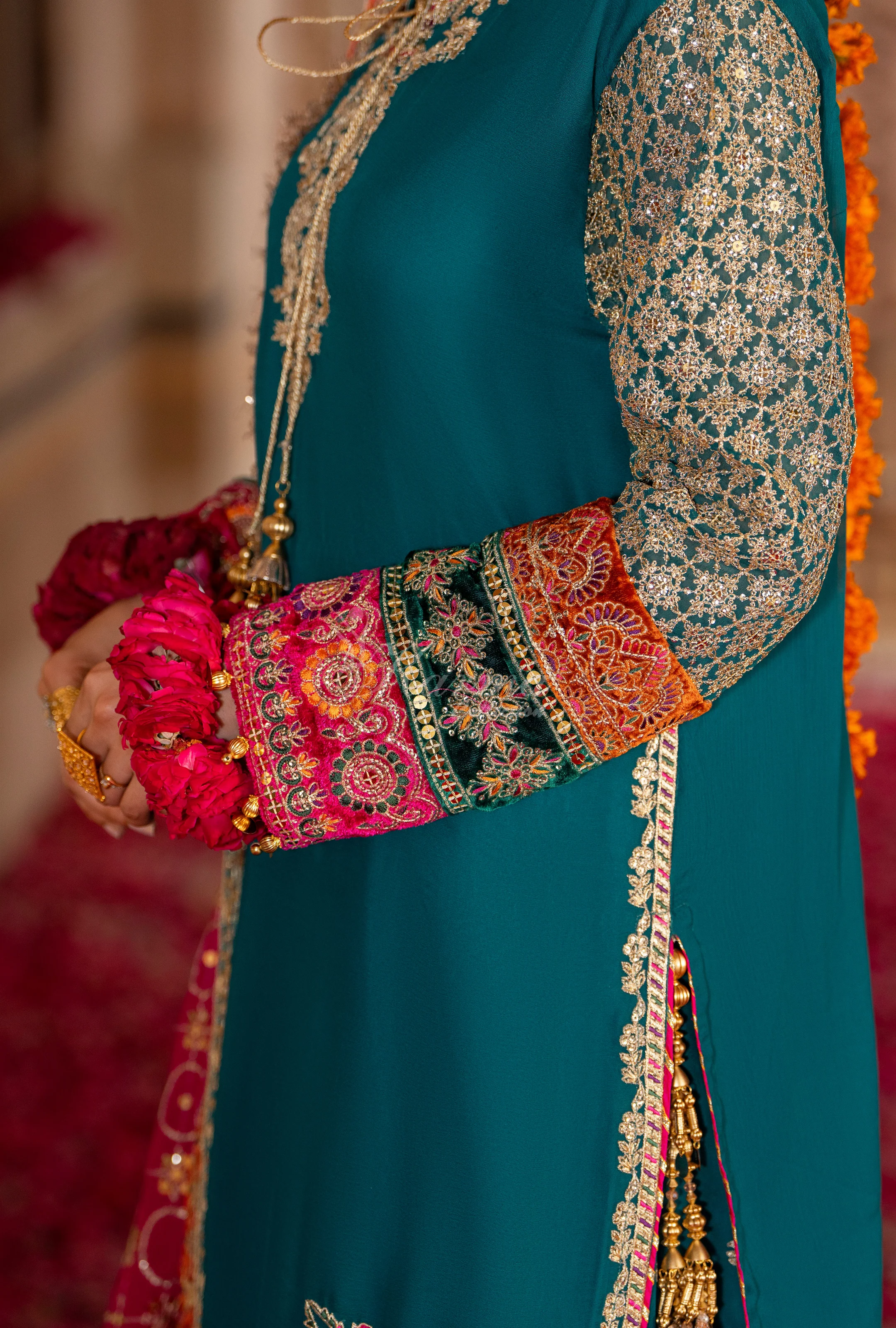 Chiffon Round Border Shirt with Tilla, Sequence, Panni work and Tussels on Neckline (Velvet