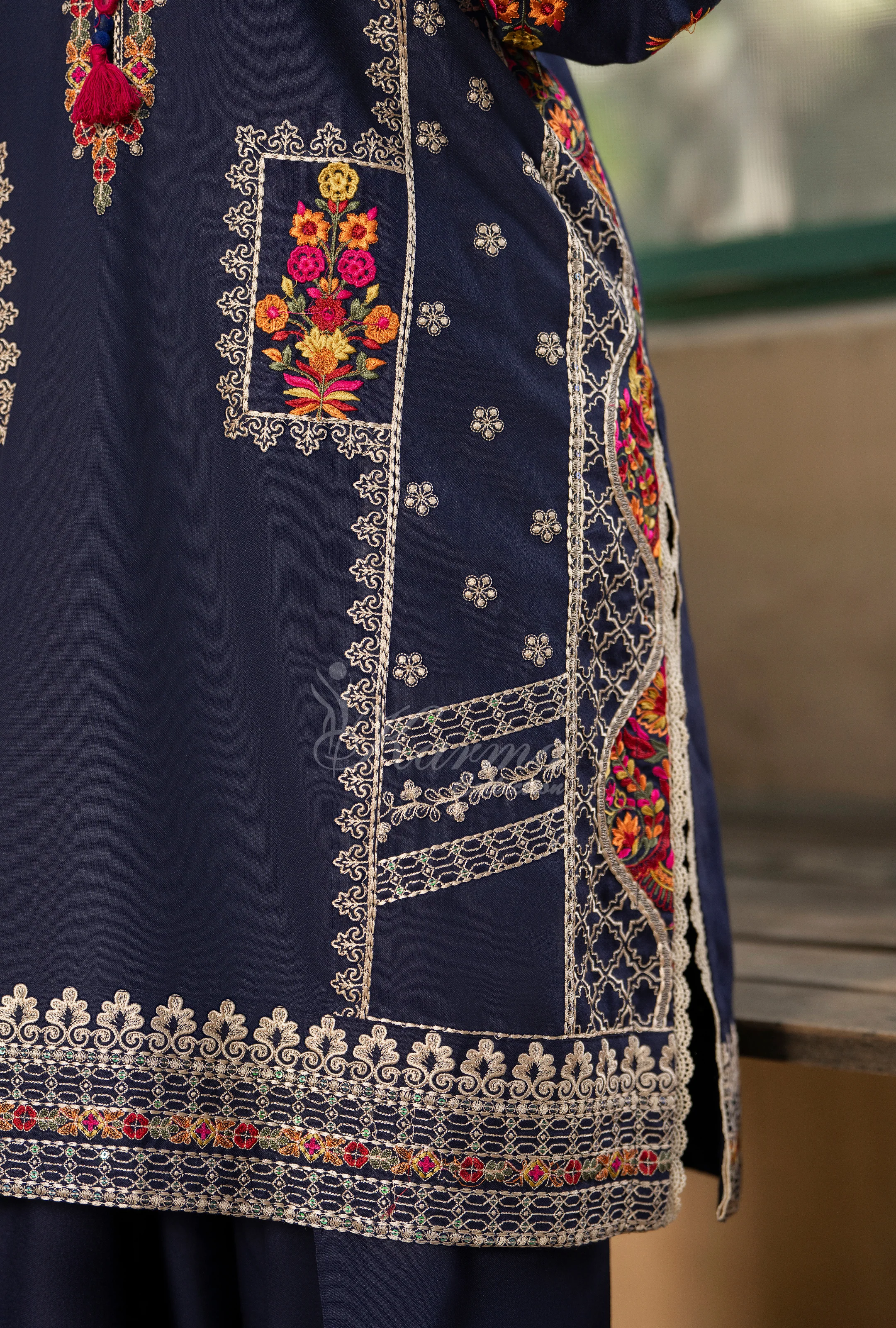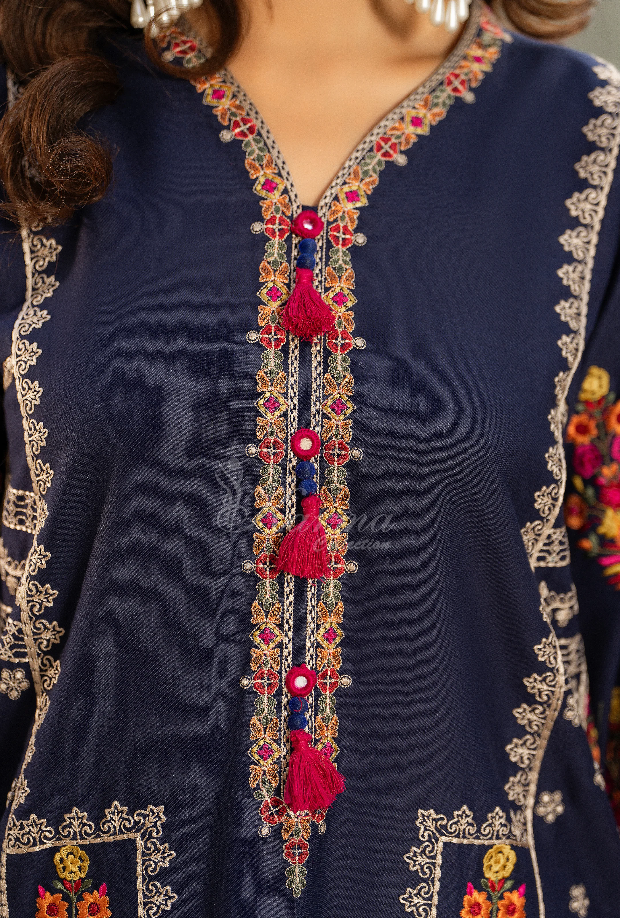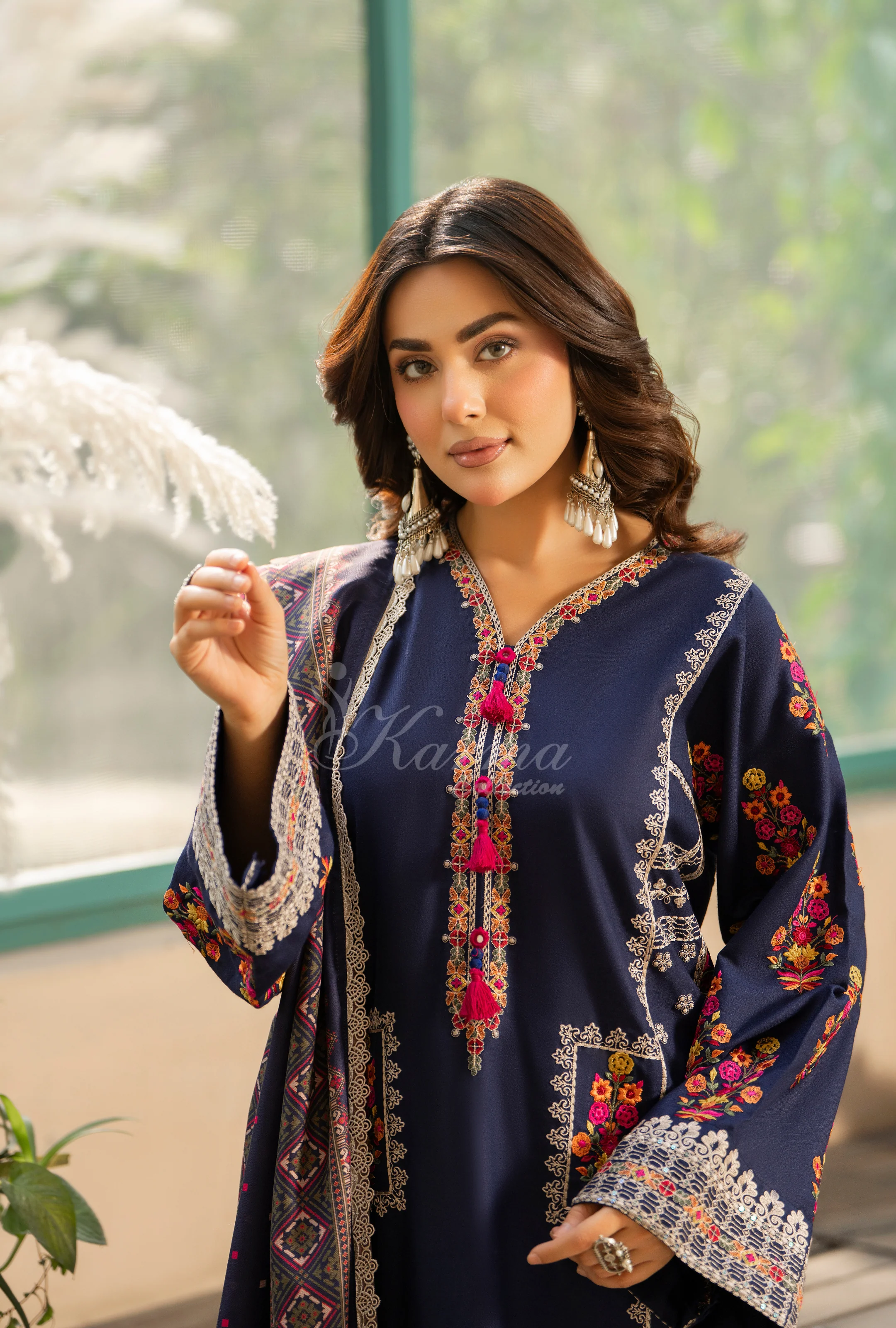 Karma Collection Winter Luxury Edition 3 Piece Embroidered Kotrai PEACOCK BLUE Shirt with Dupatta & Shalwar for Elegant Outfits KC-1521