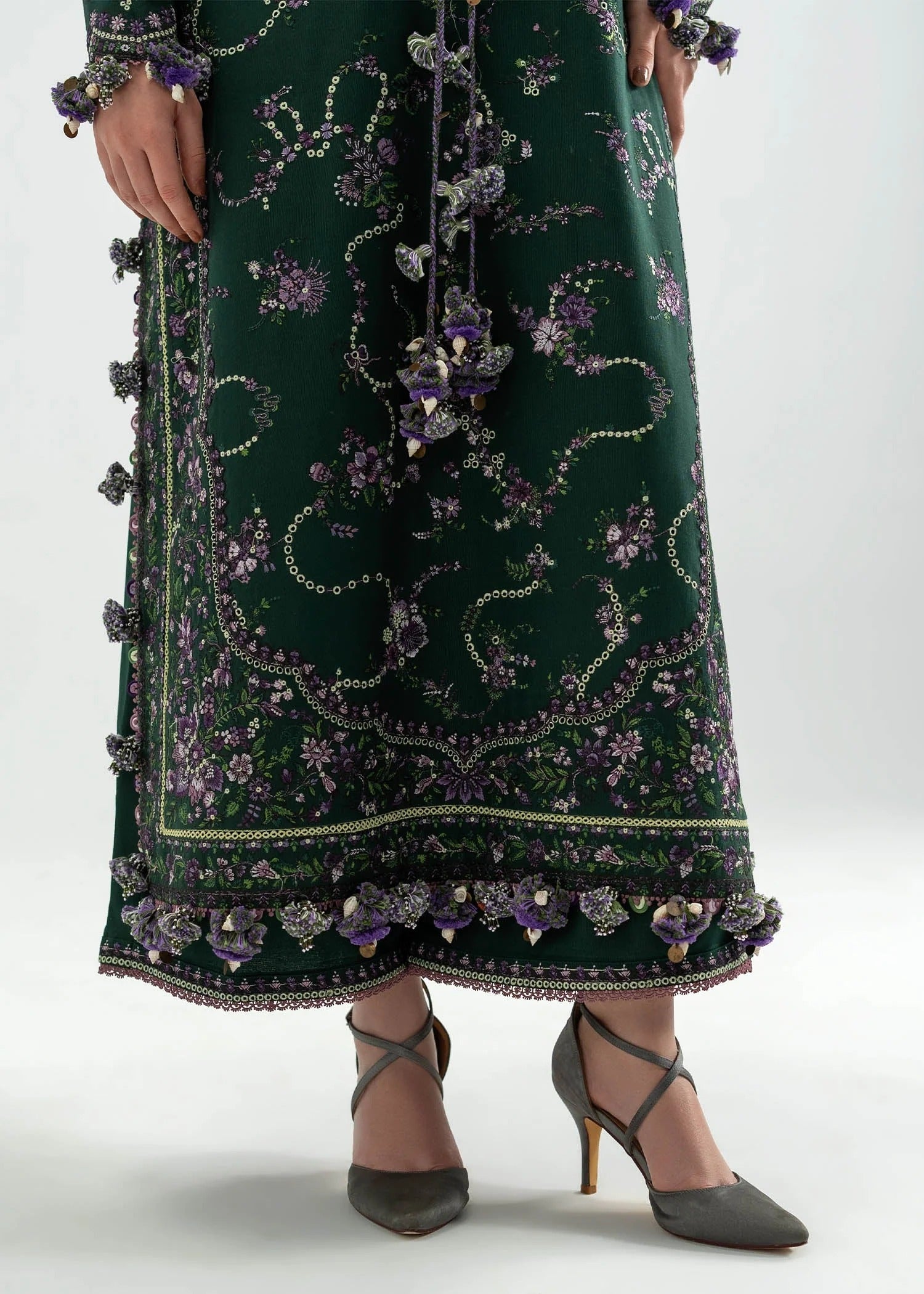 Radiating timeless elegance, this dark green long khaddar shirt features a stunning lavender traditional neckline and a delicate floral jaal cascading down the center. The design is elevated with a beautifully composed heavy hem and intricate borders, while chintz -inspired sleeves add a touch of artistic charm. Paired with a matching bordered culotte and a printed deep purple wool shawl adorned with traditional floral patterns and finished with printed facings — this ensemble captures the essence of heritage with a modern, graceful allure.